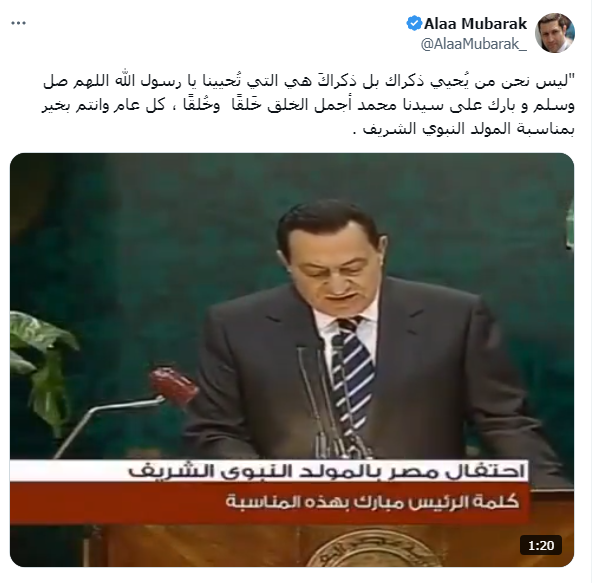 كما تذكر علاء مبارك والده الراحل في ذكرى المولد النبوي، وبث مقطع فيديو لأحد الاحتفالات بالمولد تحدث فيه والده، والذي قال فيه الرئيس الراحل مبارك: "يدور الزمان دورته، وتمر بنا الذكرى العطرة لمولد النبي الهادي، فتلتقي حولها قلوب المسلمين، في مشارق الأرض ومغاربها، حبًا لنبي الإسلام، واعترافًا بفضله وتخليدًا لذكراه، بعث الله محمد بالهدى ودين الحق، فكان صلوات الله وسلامه عليه شاهدًا ومبشرًا ونذيرا، بلغ آخر رسالات السماء إلى الأرض، أرسى بكلمات ربه وسنته المطهرة دعائم دين عظيم"