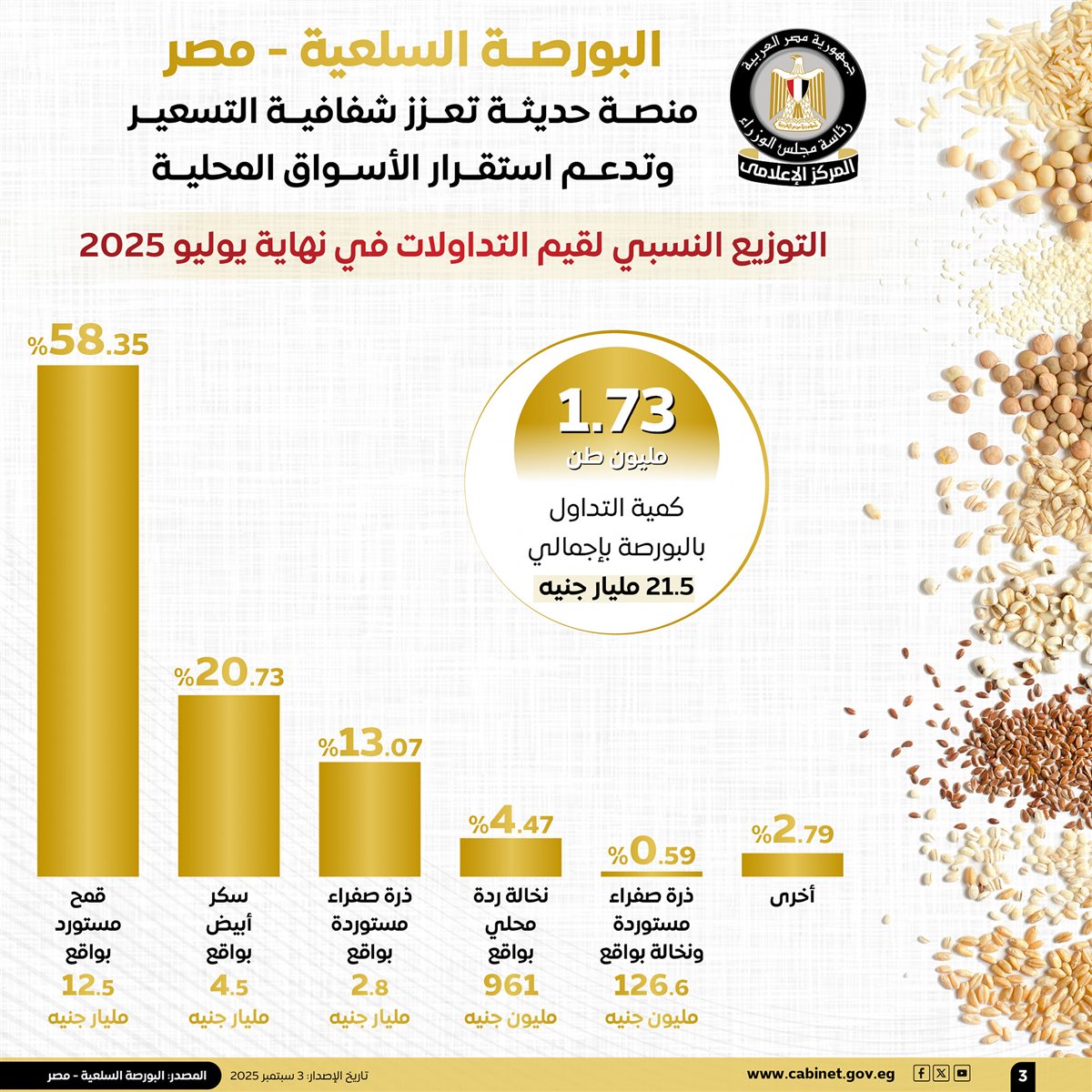 وبشأن إجمالي التداولات بالبورصة السلعية في نهاية يوليو 2025، أشارت الإنفوجرافات إلى أن كمية التداول بالبورصة بلغت 1.73 مليون طن بإجمالي 21.5 مليار جنيه، حيث بلغ نصيب القمح المستورد من إجمالي قيم التداولات 58.35% بواقع 12.5 مليار جنيه، والسكر الأبيض 20.73% بواقع 4.5 مليار جنيه، والذرة الصفراء المستوردة 13.07% بواقع 2.8 مليار جنيه، ونخالة الردة المحلية 4.47% بواقع 961 مليون جنيه، و0.59% للذرة الصفراء المستوردة والنخالة بواقع 126.6 مليون جنيه، و2.79% لسلع أخرى.