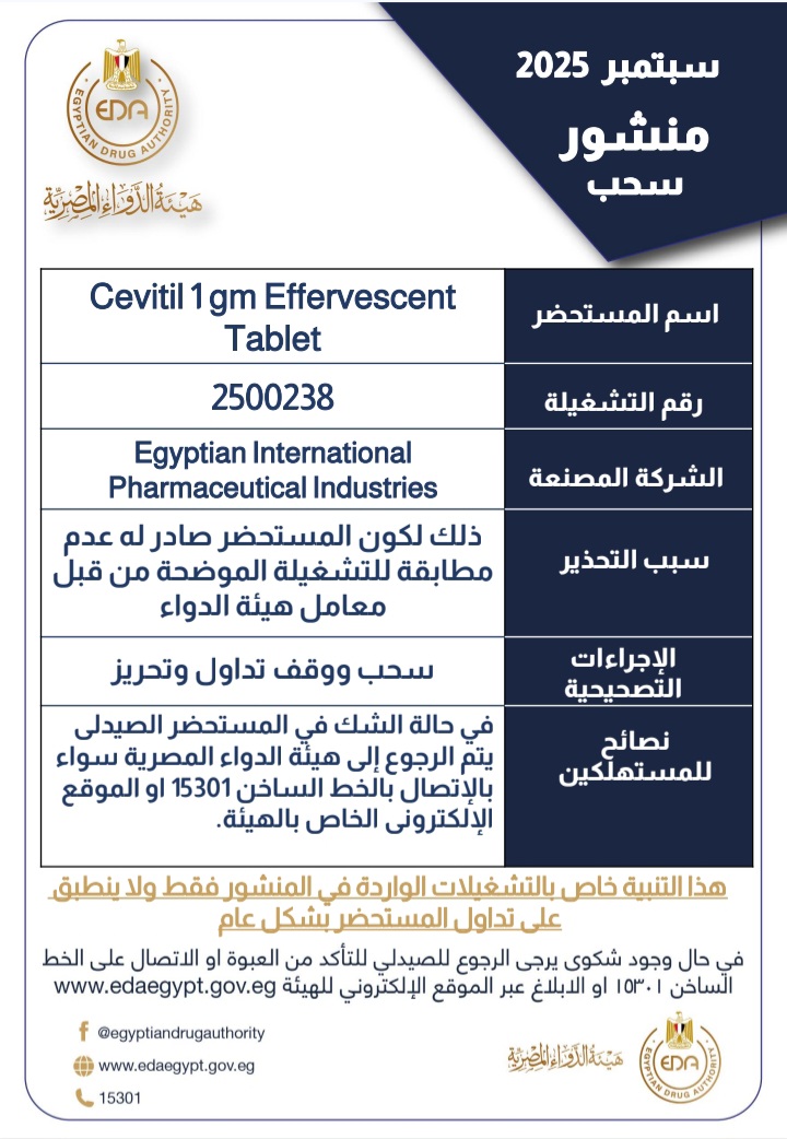 أصدرت هيئة الدواء المصرية منشورا في سبتمبر 2025، قررت فيه سحب وتشديد الرقابة على تشغيلات محددة من مستحضر (سيفتيل 1 جرام أقراص فوار) Cevitil 1gm Effervescent Tablet وذلك بسبب عدم مطابقة التشغيلات للمعايير المحددة بمعامل الهيئة.