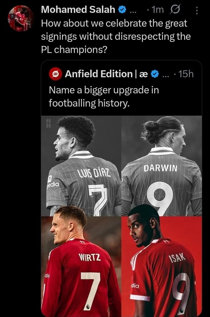 رد محمد صلاح لاعب ليفربول وقائد منتخب مصر على حساب داعم لليفربول حاول التقليل من لويس دياز وداروين نونيز، بعد التعاقد مع الثنائي فيرتز والكسندر إيزاك.