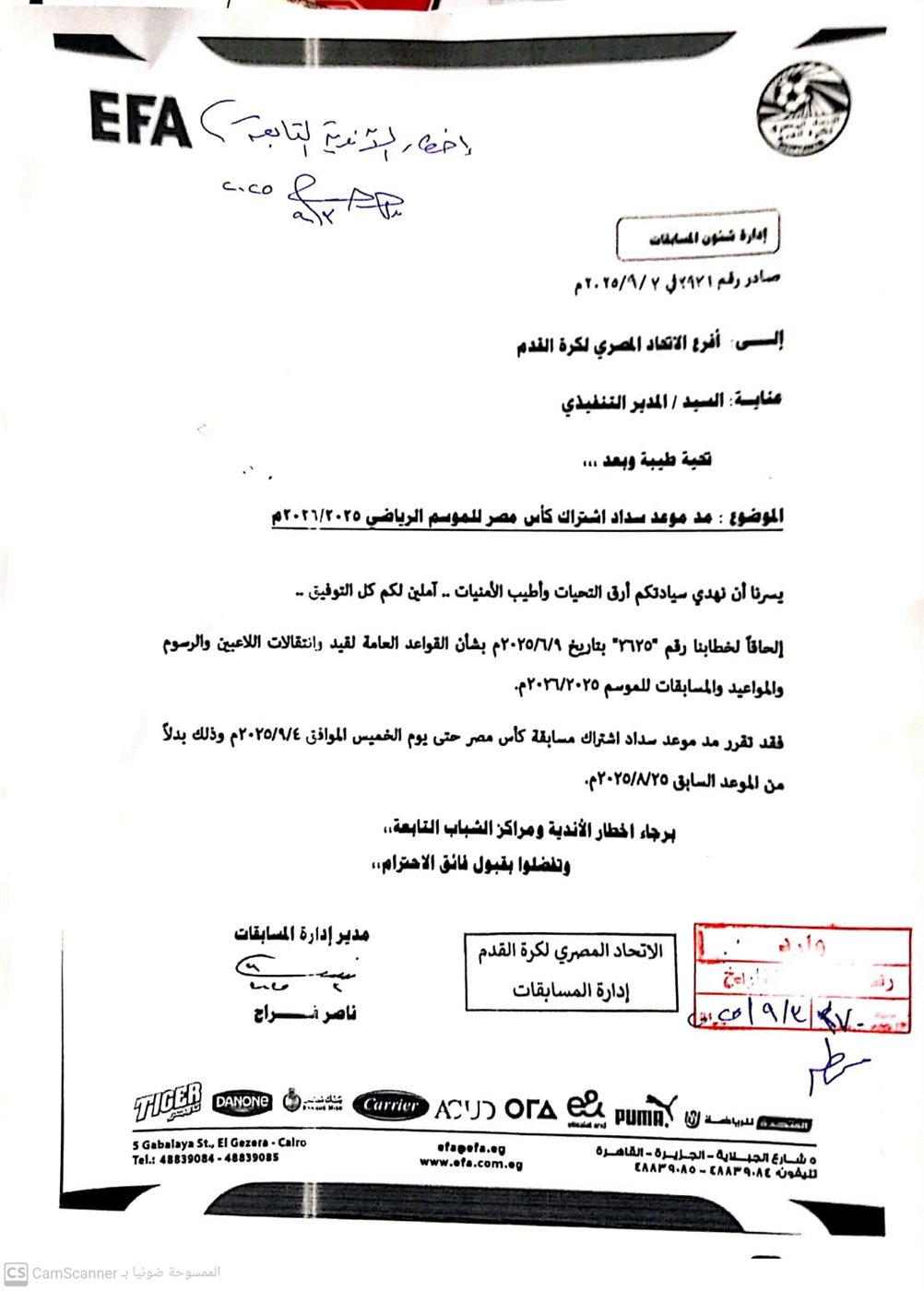 وكانت إدارة المسابقات بالاتحاد المصري لكرة القدم، أرسلت خطابات إلى أندية القسم الأول والثاني والثالث والرابع بشأن المشاركة في بطولة كأس مصر موسم 2025 - 2026.