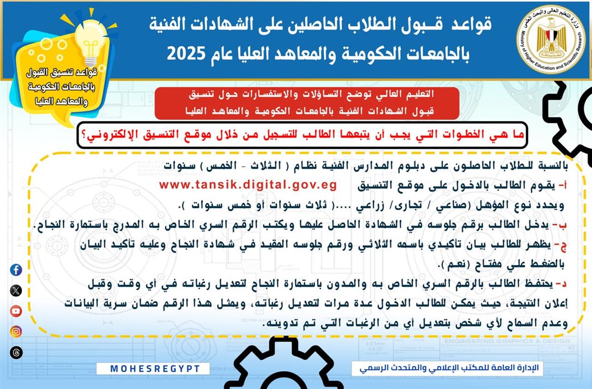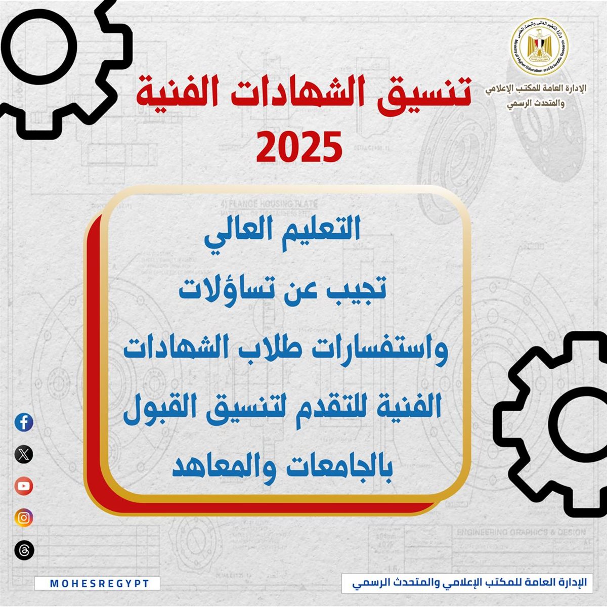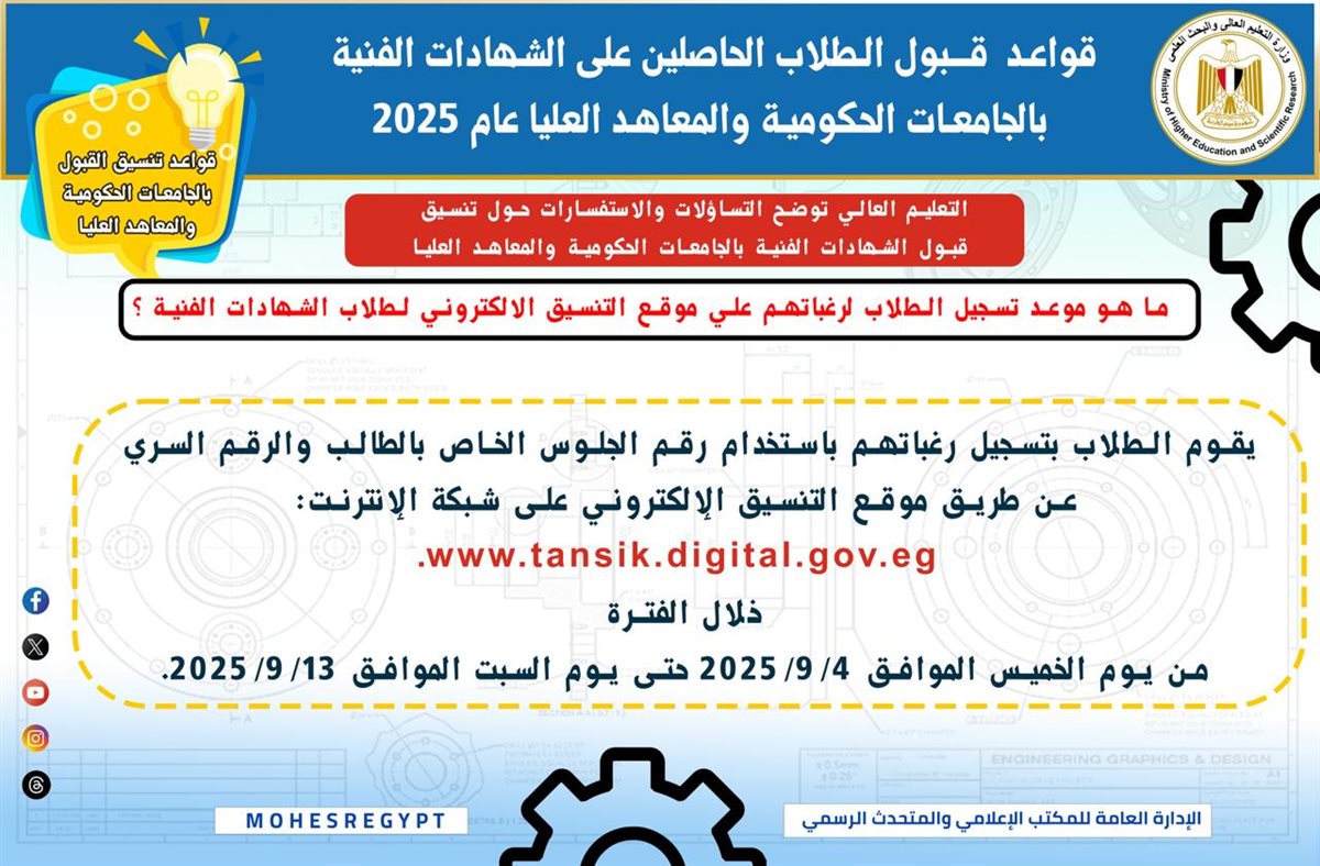 وذلك استعدادًا لبدء أعمال تسجيل رغبات طلاب الشهادات الفنية في تنسيق القبول بالجامعات الحكومية والمعاهد للعام الجامعي 2025/2026، غدًا الخميس.