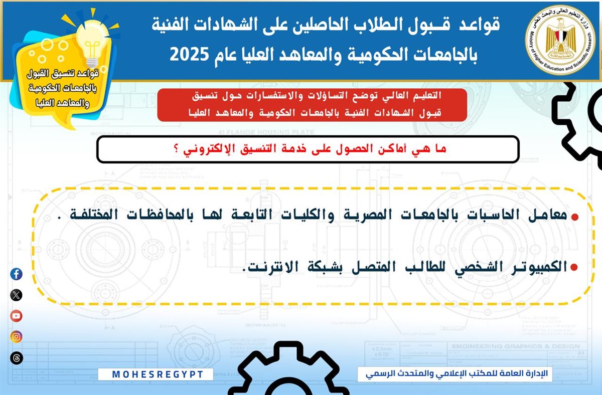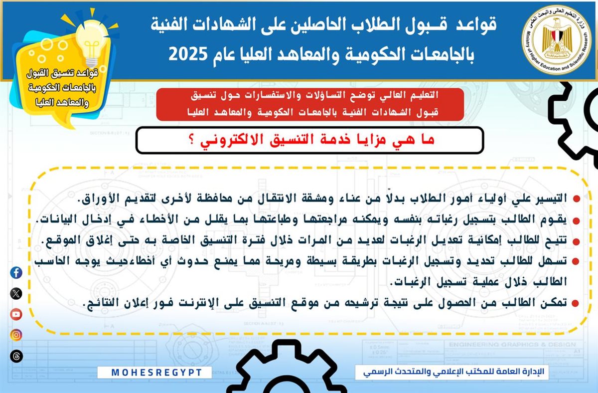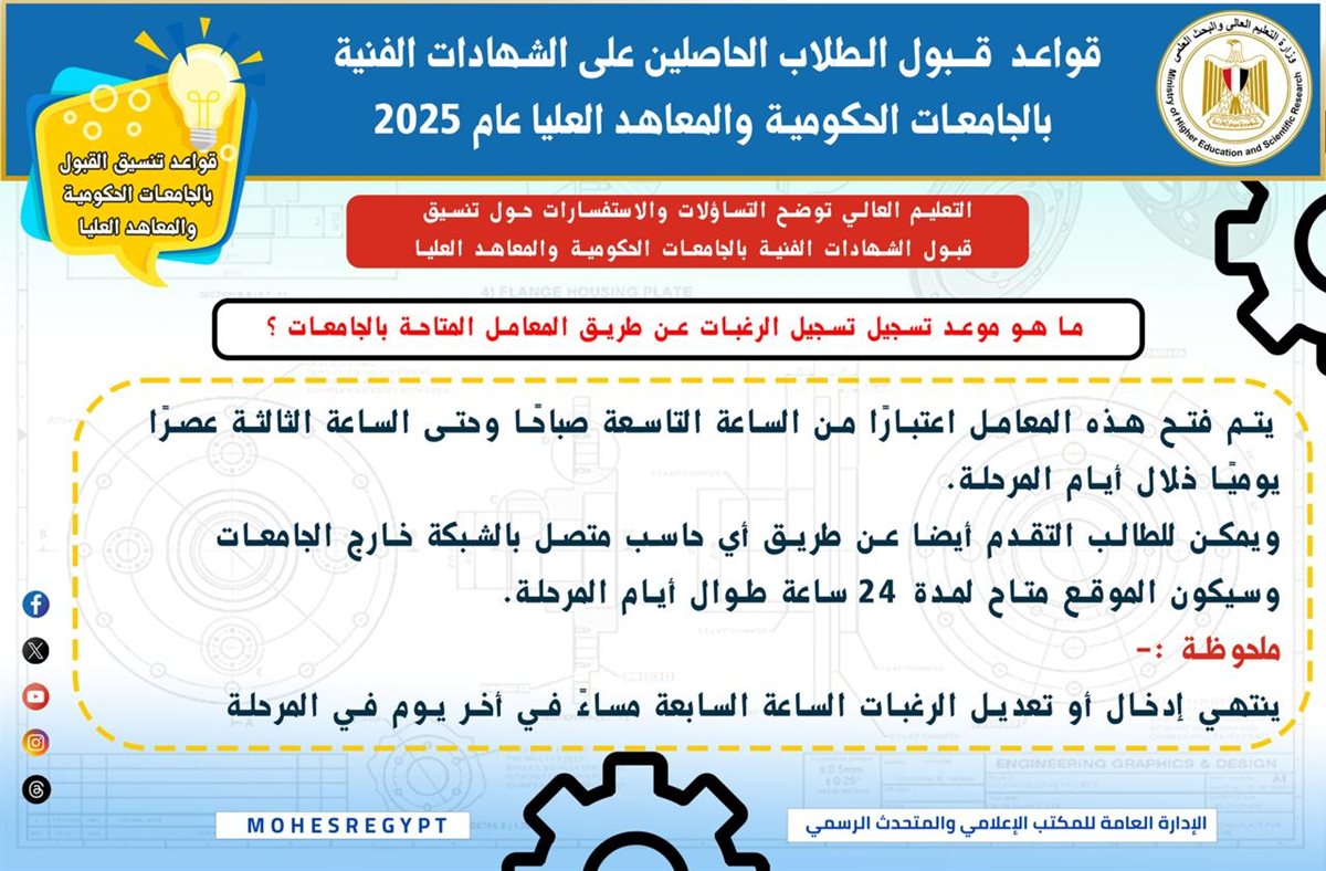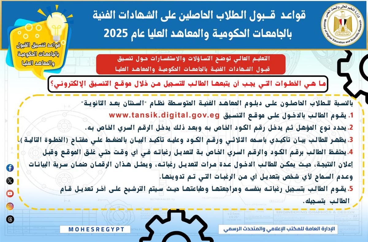 وذلك استعدادًا لبدء أعمال تسجيل رغبات طلاب الشهادات الفنية في تنسيق القبول بالجامعات الحكومية والمعاهد للعام الجامعي 2025/2026، غدًا الخميس.