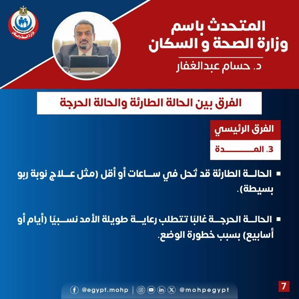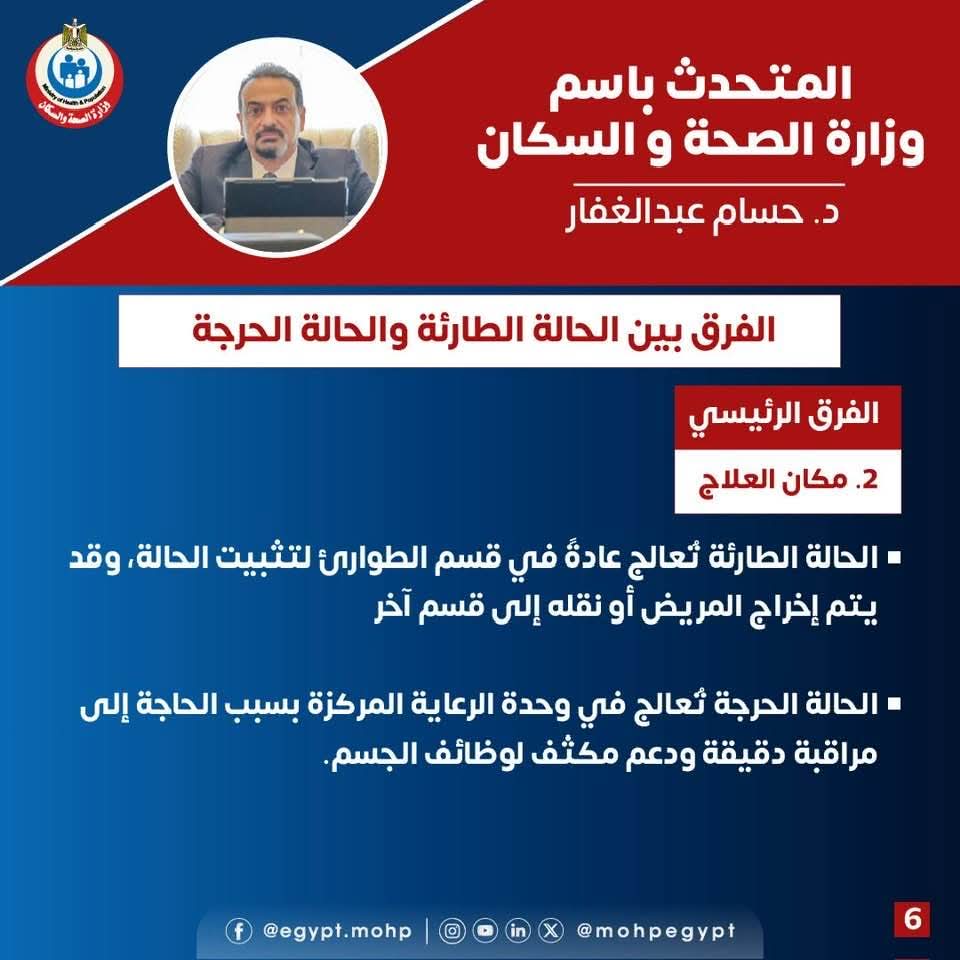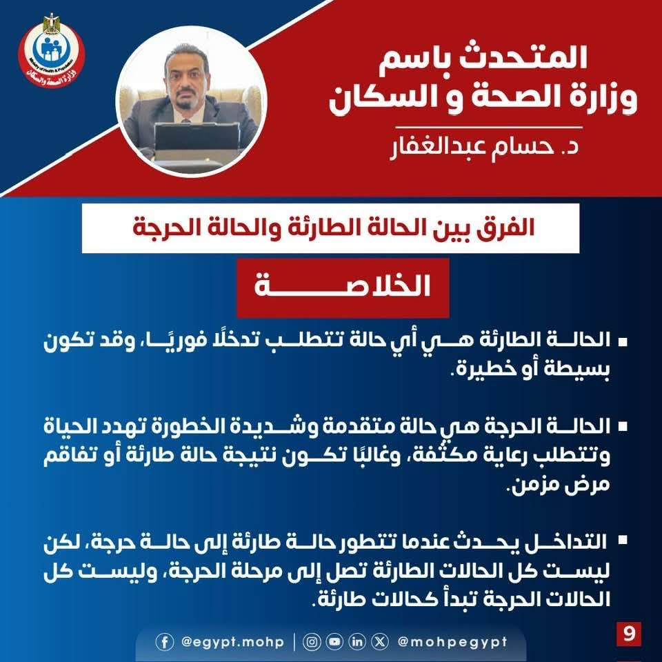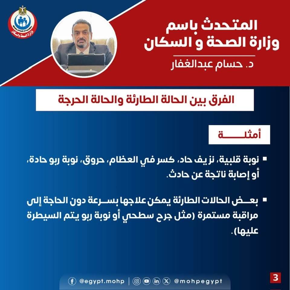 أوضح المتحدث الرسمي أن الحالة الطارئة هي أي وضع صحي يستدعي التدخل العاجل، وقد يكون بسيطًا أو خطيرًا، بينما الحالة الحرجة تعد مرحلة متقدمة وخطيرة تهدد الحياة وتتطلب رعاية مكثفة.
