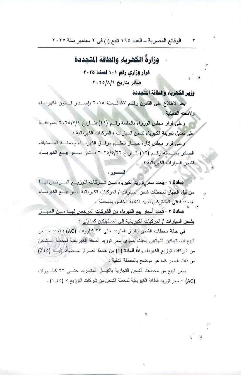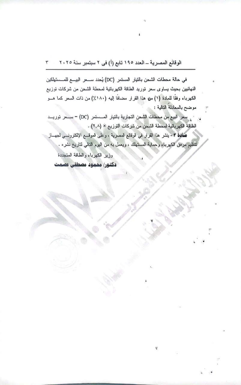 الشحن السريع (DC): ارتفع سعر الكيلو وات من 3.75 جنيه إلى 6.55 جنيهات، بزيادة 75%.