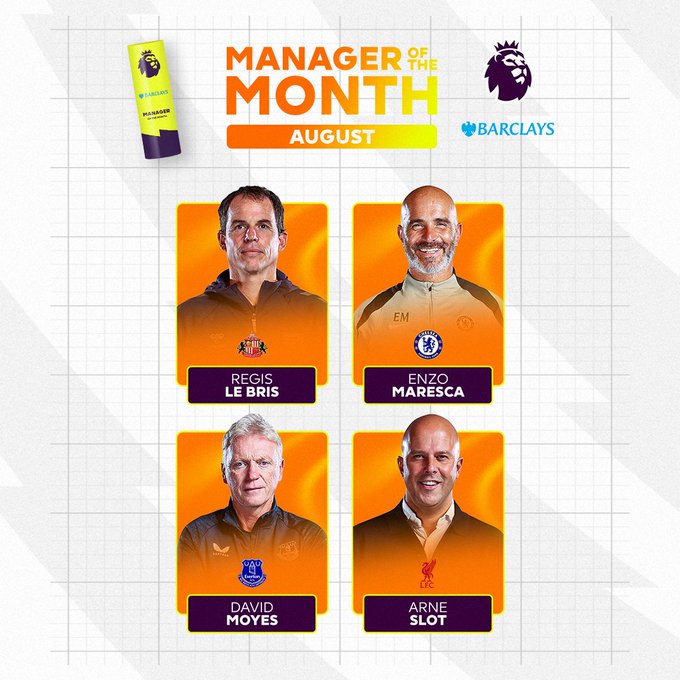 بينما يتنافس على جائزة أفضل مدرب في الشهر كل من: انزومارسكا مدرب تشيلسي، ولوريس مدرب سندرلاند، وأرني سلوت مدرب ليفربول، وديفيد مويس مدرب ايفرتون.