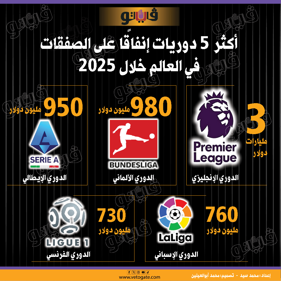 أكثر 5 دوريات إنفاقًا على الصفقات في العالم خلال 2025 (إنفوجراف)