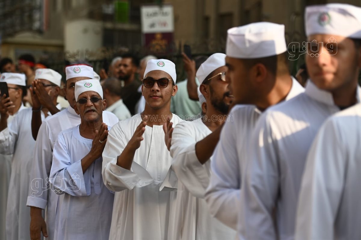 بالجلابيب البيضاء والرايات الخضراء، شاهد احتفالات الطرق الصوفية بالمولد النبوي أمام مسجد الحسين (صور)