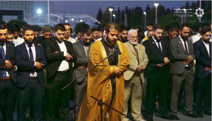 شاركت الصفحة الرسمية لمعرض دمشق الدولي على موقع "فيسبوك"، صورًا لـ أدهم نابلسي وهو يؤم جموع المصلين في ساحة الأعلام.