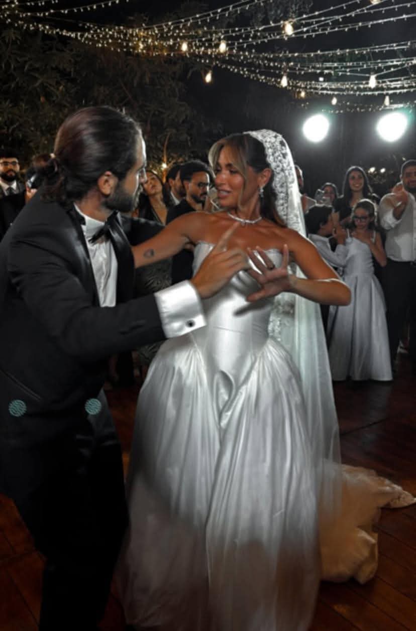 وطلت السراج بفستان أبيض مميز واعتمدت على لوك مكياج ساحر بالألوان الجريئة وتركت شعرها منسدلا مع الاعتماد على الألماس، فيما ارتدى زوجها بدلة باللوني الأبيض والأسود.
