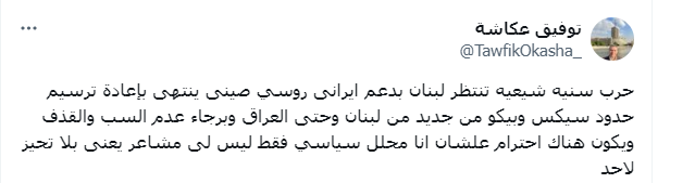 وقال الإعلامي توفيق عكاشة عن المخطط الجديد بـ إعادة ترسيم خريطة الشرق الأوسط الذي ينتظر لبنان: "حرب سنيه شيعيه تنتظر لبنان بدعم إيراني روسي صينى ينتهى بإعادة ترسيم حدود سيكس وبيكو من جديد من لبنان وحتى العراق... أنا محلل سياسي فقط ليس لى مشاعر يعنى بلا تحيز لأحد".