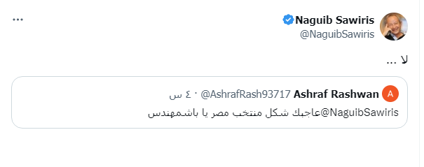 وكان أحد متابعي المهندس نجيب ساويرس وجه سؤالا له عن مدى إعجابه بـ شكل منتخب مصر، فقال: "عاجبك شكل منتخب مصر يا باشمهندس؟"