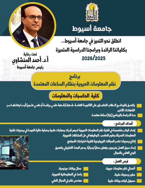 أعلنت كلية الحاسبات والمعلومات بجامعة أسيوط، تحت رعاية الدكتور أحمد المنشاوي رئيس الجامعة، عن إطلاق برنامج جديد بعنوان "نظم المعلومات الحيوية" ضمن برامجها المتميزة للعام الجامعي 2025 /2026.