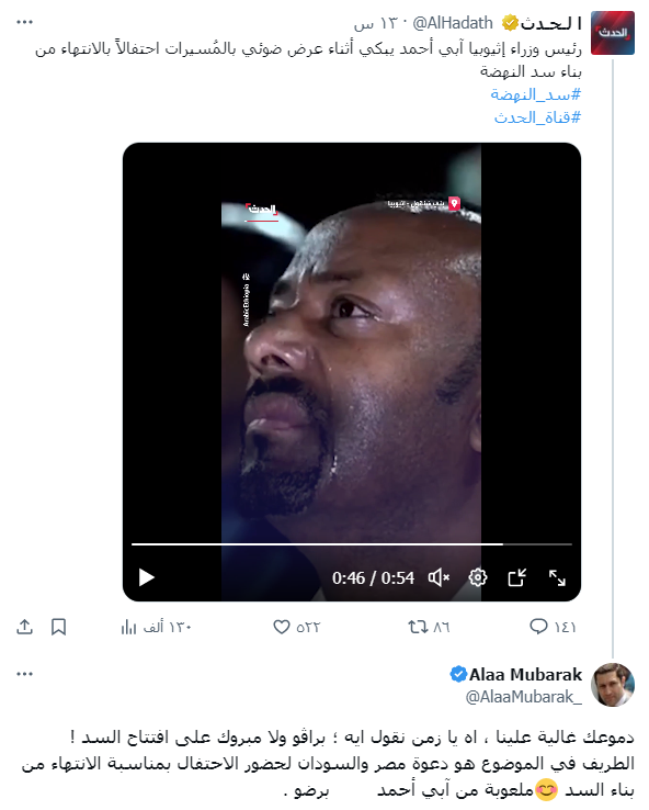 آه يا زمن، علاء مبارك يسخر من بكاء آبي أحمد بافتتاح سد النهضة ونشطاء: دموع التماسيح