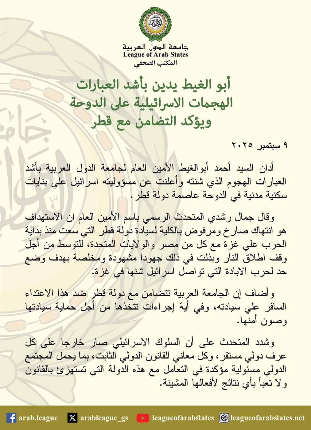 أدان أحمد أبو الغيط الأمين العام لجامعة الدول العربية بأشد العبارات الهجوم الذي شنته، وأعلنت عن مسؤوليته إسرائيل علي بنايات سكنية مدنية في الدوحة عاصمة دولة قطر.