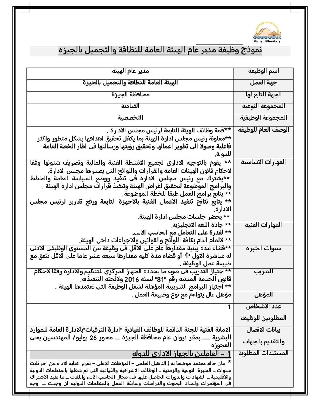 أعلنت محافظة الجيزة، حاجتها لشغل وظيفة مدير عام الهيئة العامة للنظافة والتجميل بالمحافظة، وذلك في إطار خطة الدولة للارتقاء بمستوى الخدمات المقدمة للمواطنين وتحقيق أهداف التنمية المستدامة.