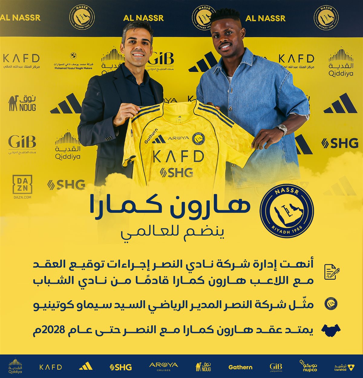فيما أعلن نادي النصر السعودي، التعاقد رسميًا مع المهاجم هارون كمارا قادمًا من نادي الشباب، بعقد يمتد حتى صيف 2028، في صفقة بلغت قيمتها نحو 18 مليون ريال سعودي.