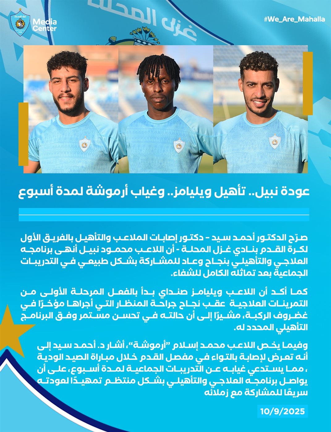 صرح الدكتور أحمد سيد، أخصائي إصابات الملاعب والتأهيل بالفريق الأول لكرة القدم بنادي غزل المحلة، أن اللاعب محمود نبيل أنهى برنامجه العلاجي والتأهيلي بنجاح وعاد للمشاركة بشكل طبيعي في التدريبات الجماعية بعد تماثله الكامل للشفاء.