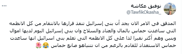 وتابع توفيق عكاشة: "وأن بني إسرائيل اليوم لديها أموال وبنين وهم أكثر نفيرا، لذا على كل الأنظمه التي تعلم بني إسرائيل أنها ساعدت حماس الاستعداد للقادم بالرغم من أن نتنياهو صانع حماس".