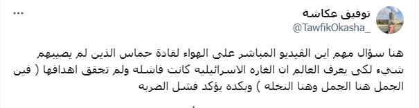 وطالب توفيق عكاشة بإظهار مقطع فيديو لقادة حماس الذين نجوا من الاستهداف الإسرائيلي للتأكيد على فشل الاحتلال في ضربته لمقرات حماس في قطر، فقال: "هنا سؤال مهم أين الڤيديو المباشر على الهواء لقادة حماس الذين لم يصيبهم شيء لكي يعرف العالم أن الغارة الإسرائيلية كانت فاشلة ولم تحقق أهدافها (فين الجمل هنا الجمل وهنا النخلة) وبكده يؤكد فشل الضربة".