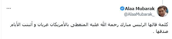 وقال علاء مبارك كاشفًا عن صدق مقولة والده الراحل حسني مبارك: "كلمة قالها الرئيس مبارك رحمة الله عليه المتغطى بالأمريكان عريان وأثبتت الأيام صدقها".