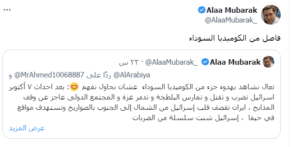 وفي تغريدة سابقة عبر منصة "أكس"، في تفسيره لما يحدث في المنطقة منذ طوفان الأقصى في 7 أكتوبر 2023 وحتى اليوم، قال علاء مبارك "تعال نشاهد بهدوء جزء من الكوميديا السوداء عشان نحاول نفهم؛ بعد أحداث ٧ أكتوبر إسرائيل تضرب وتقتل وتمارس البلطجة وتدمر غزة والمجتمع الدولى عاجز عن وقف المذابح".