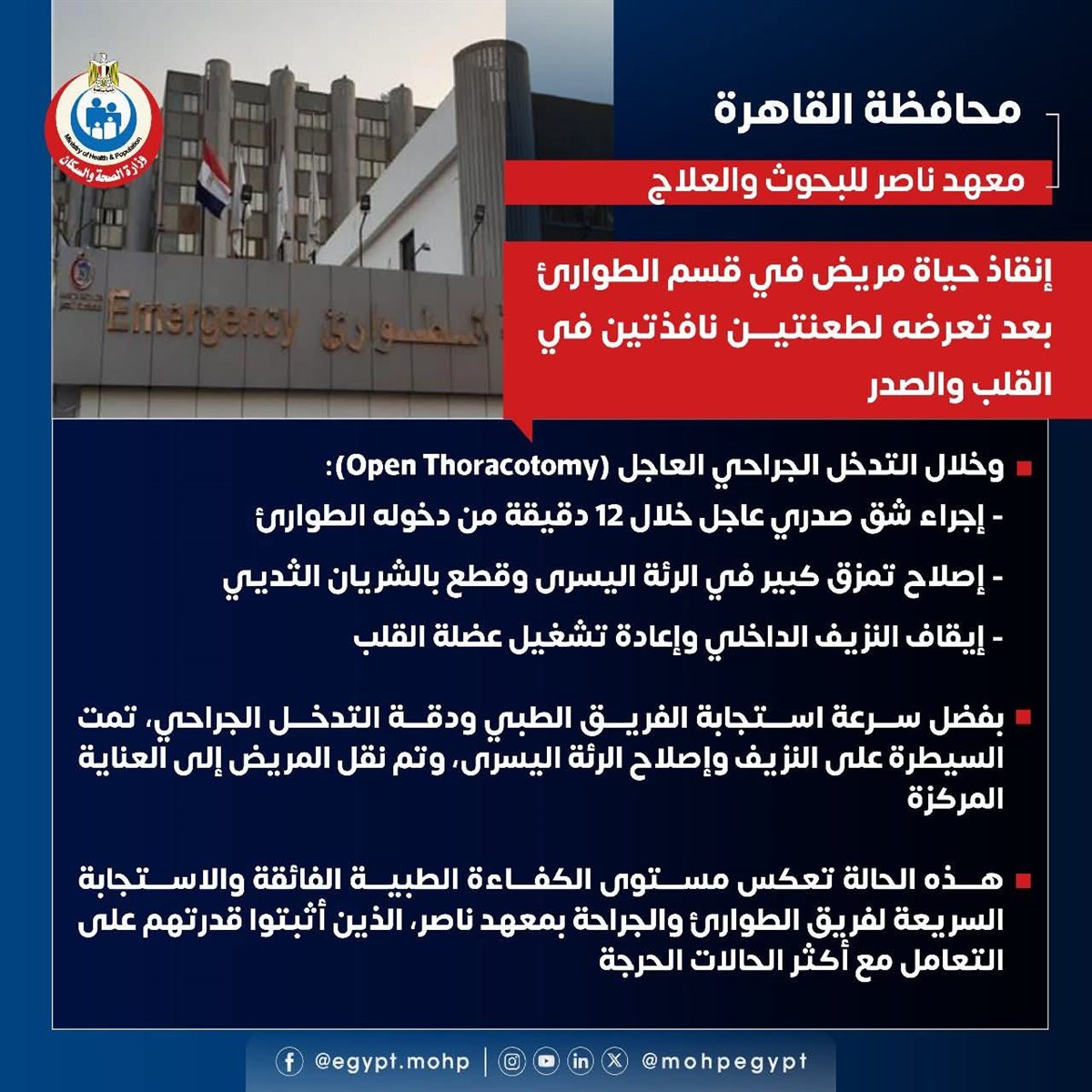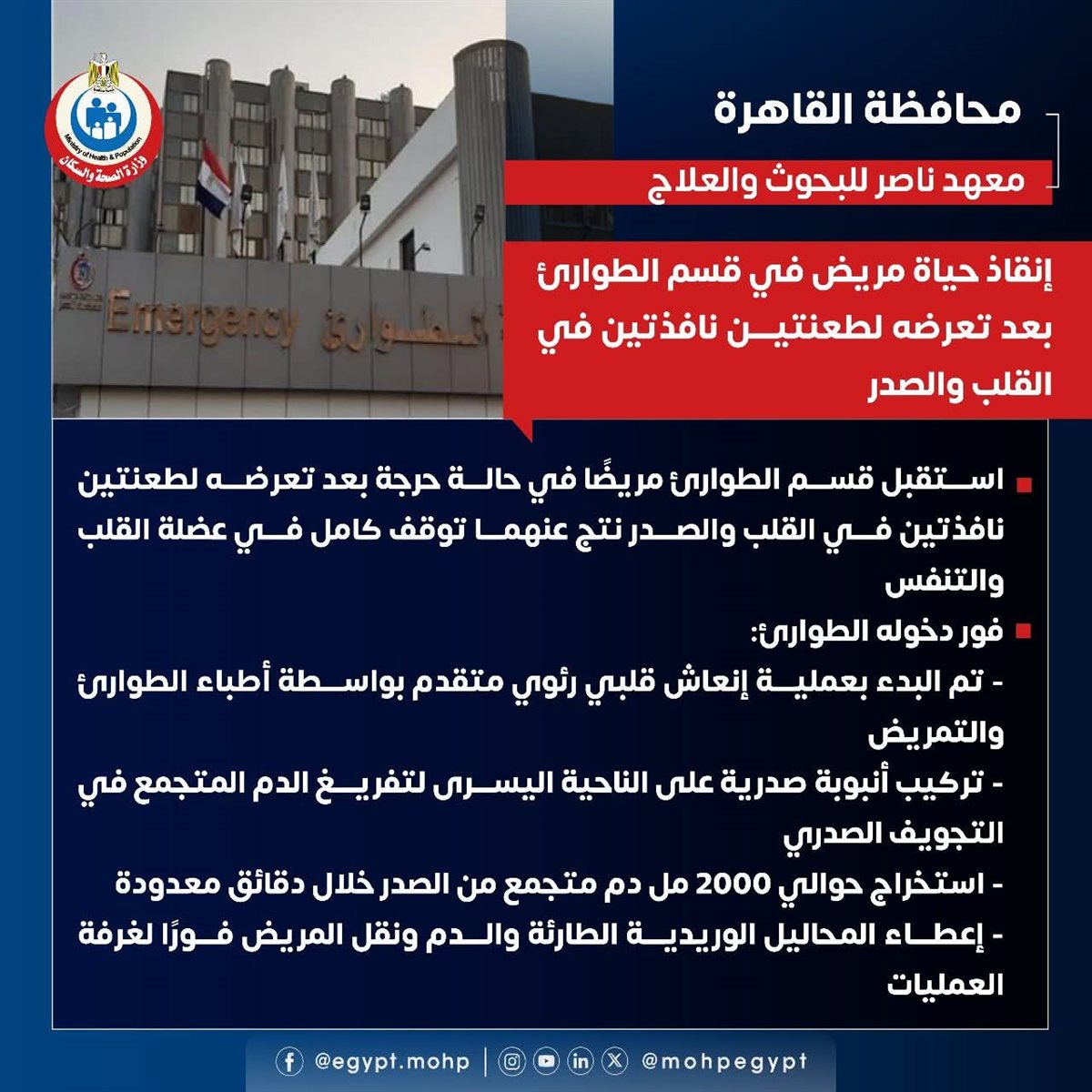 نجح فريق طبي بقسم الطوارئ في معهد ناصر للبحوث والعلاج بمحافظة القاهرة في إنقاذ حياة مريض وصل في حالة حرجة للغاية نتيجة تعرضه لطعنتين نافذتين بالقلب والصدر تسببتا في توقف كامل لعضلة القلب والتنفس.