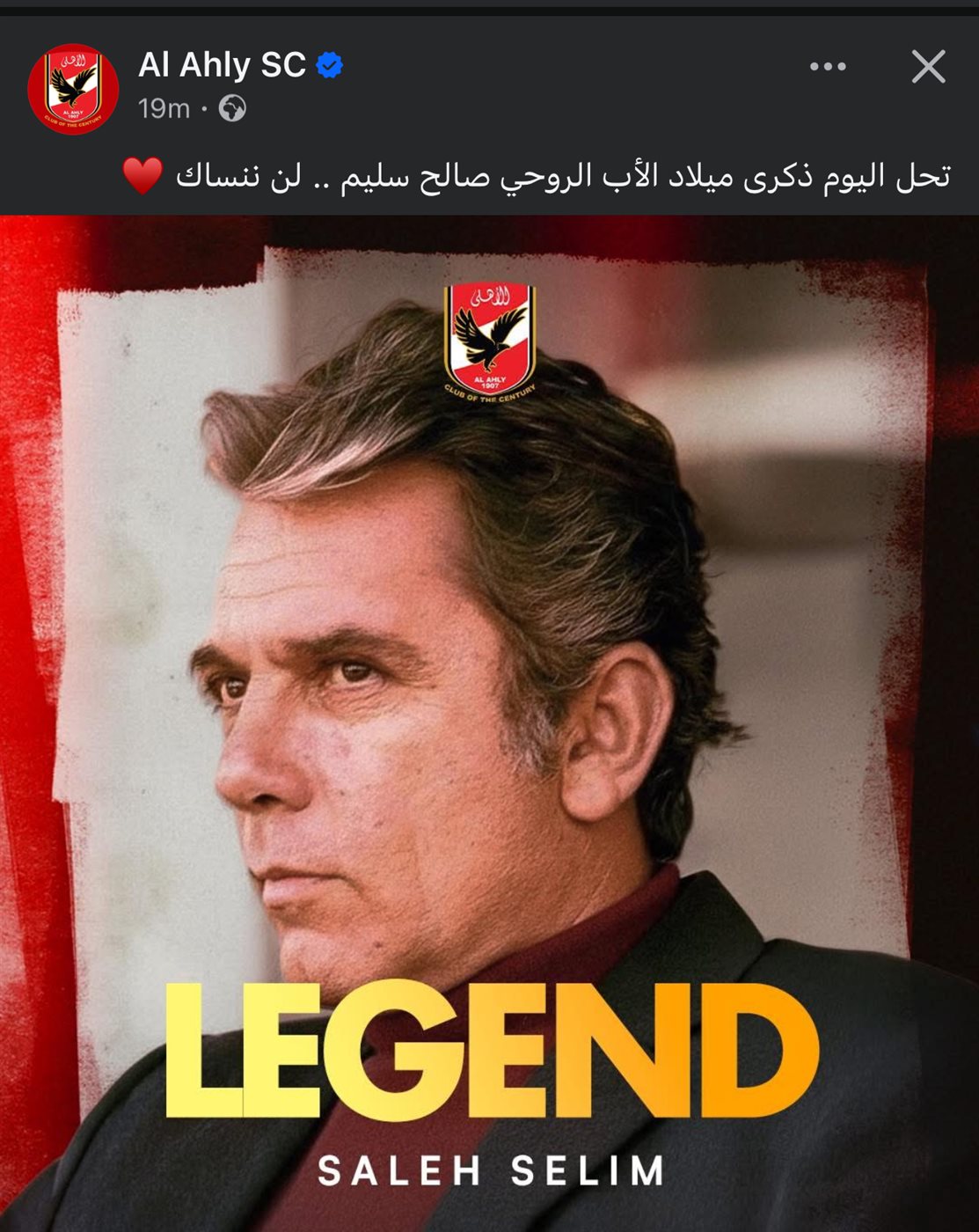 وحرص الحساب الرسمي للنادي الأهلي على إحياء ذكرى ميلاد صالح سليم، حيث نشر حساب الأحمر على فيسبوك صورة له وعلق عليها: “تحل اليوم ذكرى ميلاد الأب الروحي صالح سليم.. لن ننساك”.