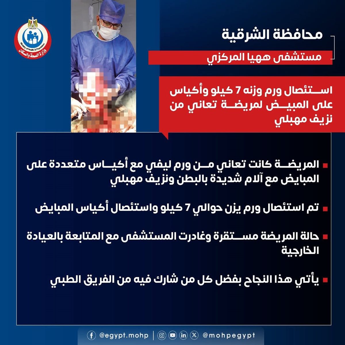 أعلنت وزارة الصحة عن نجاح الفريق الطبي بمستشفى ههيا المركزي بمحافظة الشرقية في إجراء جراحة دقيقة لاستئصال ورم ليفي يزن نحو 7 كيلوجرامات مصحوبًا بأكياس متعددة على المبيض، لمريضة كانت تعاني من نزيف مهبلي وآلام شديدة بالبطن.