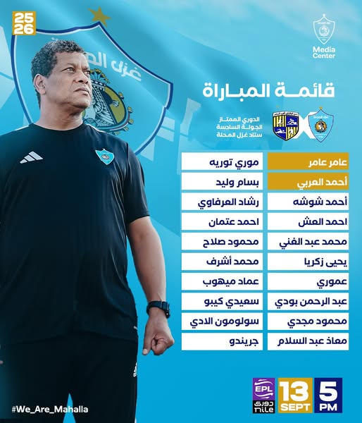 أعلن علاء عبد العال المدير الفني لنادي غزل المحلة، قائمة فريقه لمواجهة المقاولون العرب غدا السبت في الجولة السادسة لبطولة الدوري المصري الممتاز.