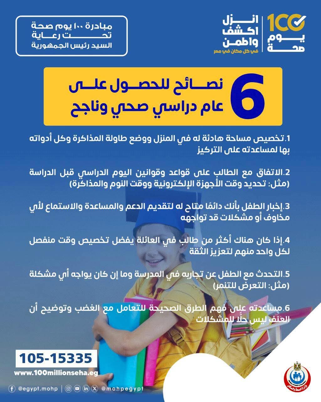 أطلقت وزارة الصحة والسكان، حملة توعوية لطلاب المدارس وأولياء الأمور، تحت شعار: "نصائح لعام دراسي صحي وناجح"، وذلك في إطار الاهتمام بصحة الأطفال ودعمهم نفسيًا وسلوكيًا خلال العام الدراسي الجديد 2025/ 2026.