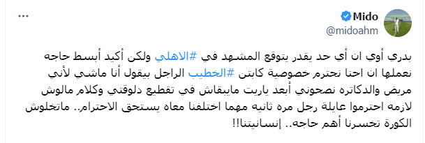 وطالب أحمد حسام "ميدو" باحترام خصوصية كابتن الخطيب، خاصة أن اعتذار الخطيب بسبب مرضه، وأنه يريد الابتعاد تبعًا لنصائح الأطباء، مؤكدًا على أهمية احترام عائلة الخطيب.