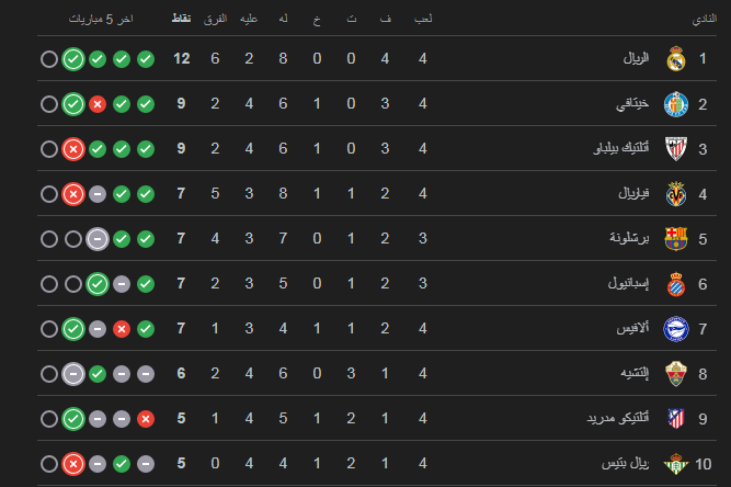 ويعد فريق ريال مدريد هو الفريق الوحيد الذي حقق العلامة الكاملة في 4 جولات لعبوا بالدوري الإسباني الممتاز.