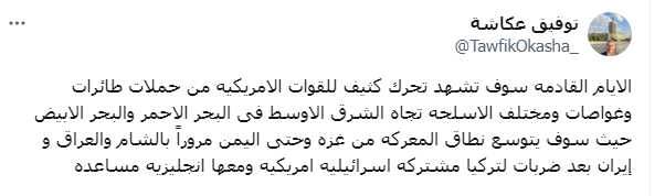وأكد توفيق عكاشة أن نطاق الحرب في منطقة الشرق الأوسط سوف تتوسع، وستضم اليمن والشام والعراق وإيران، زاعمًا أنه ستكون هناك ضربات مشتركة بين أمريكا وإسرائيل وبمساعدة إنجليزية على تركيا.