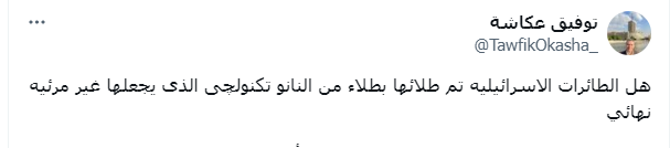 كما تساءل توفيق عكاشة محذرًا: "هل الطائرات الاسرائيليه تم طلائها بطلاء من النانو تكنولچى الذى يجعلها غير مرئيه نهائي"
