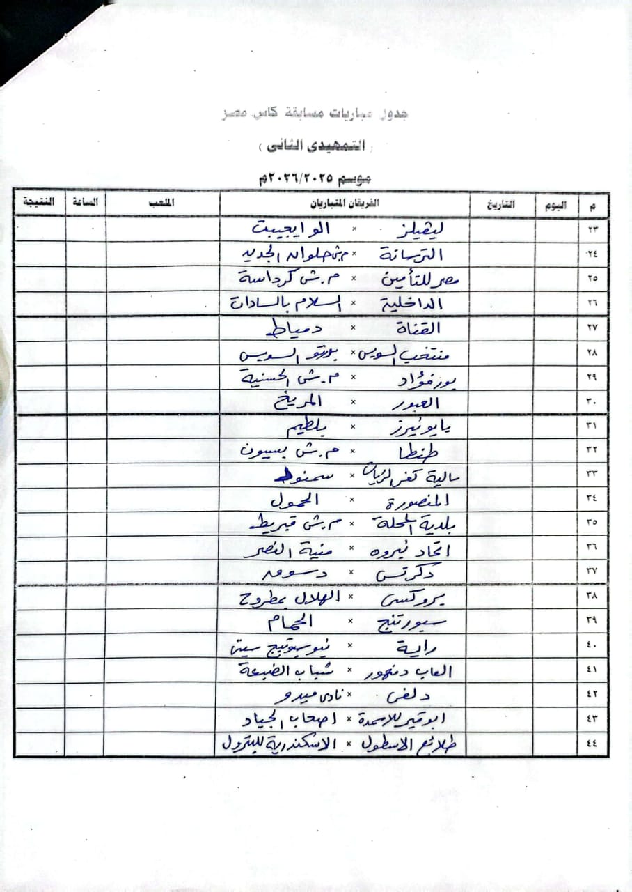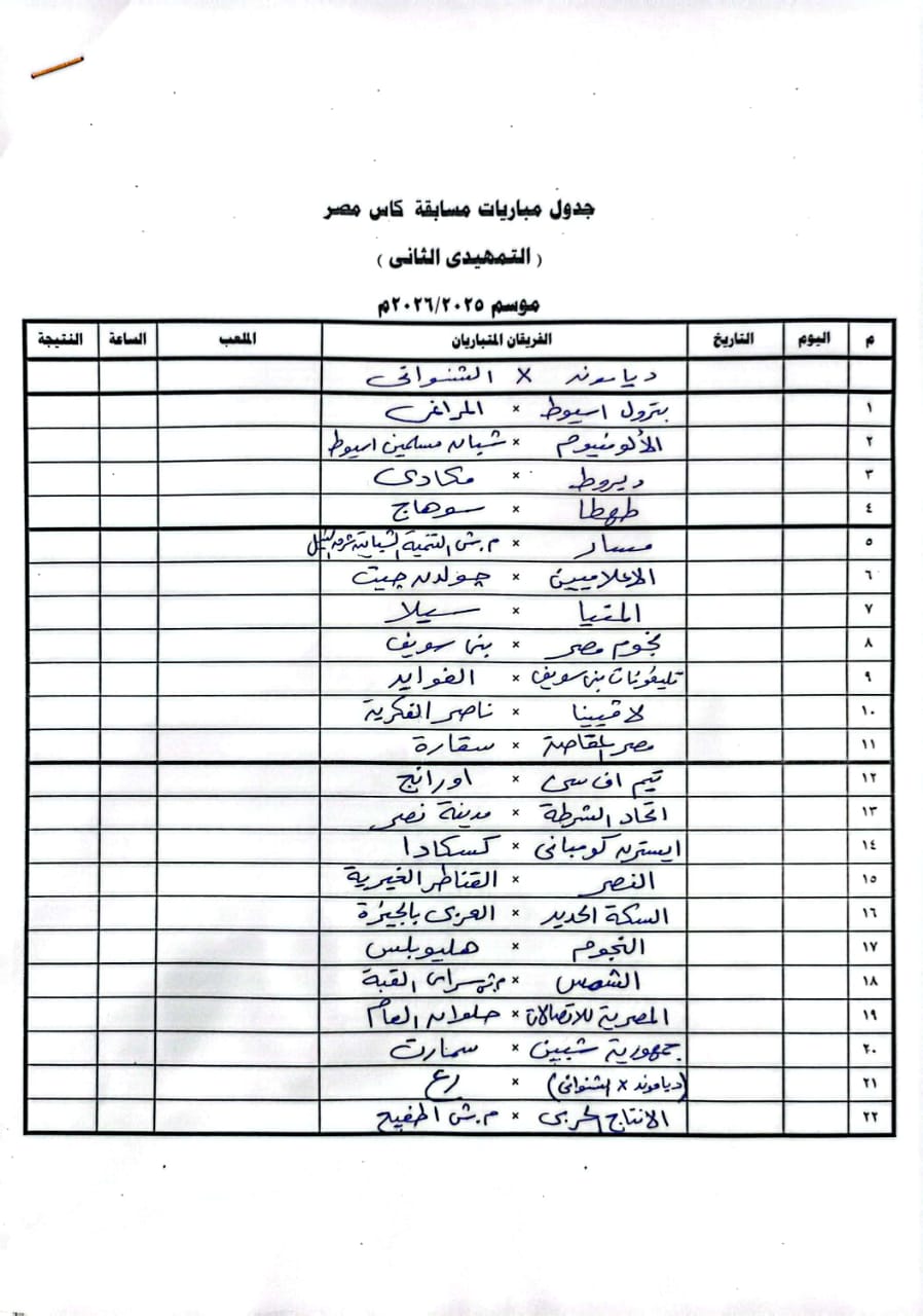 قرعة كأس مصر، أجرت إدارة المسابقات باتحاد الكرة، اليوم الأحد، مراسم سحب قرعة الدور التمهيدي الثاني لمسابقة كأس مصر، موسم 2025-2026.