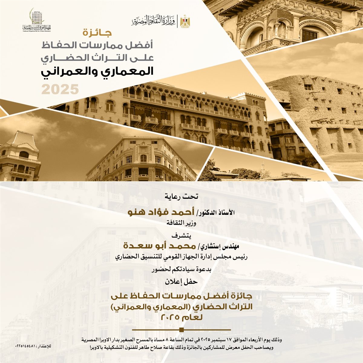 أعلن الجهاز القومي للتنسيق الحضاري برئاسة المهندس محمد أبو سعدة، وبحضور الدكتور أحمد فؤاد هنو وزير الثقافة، عن الفائز بجائزة أفضل ممارسات الحفاظ على التراث العمراني والمعماري لعام 2025، وذلك في تمام الثامنة مساء يوم الأربعاء 17 سبتمبر 2025 بالمسرح الصغير بدار الأوبرا.