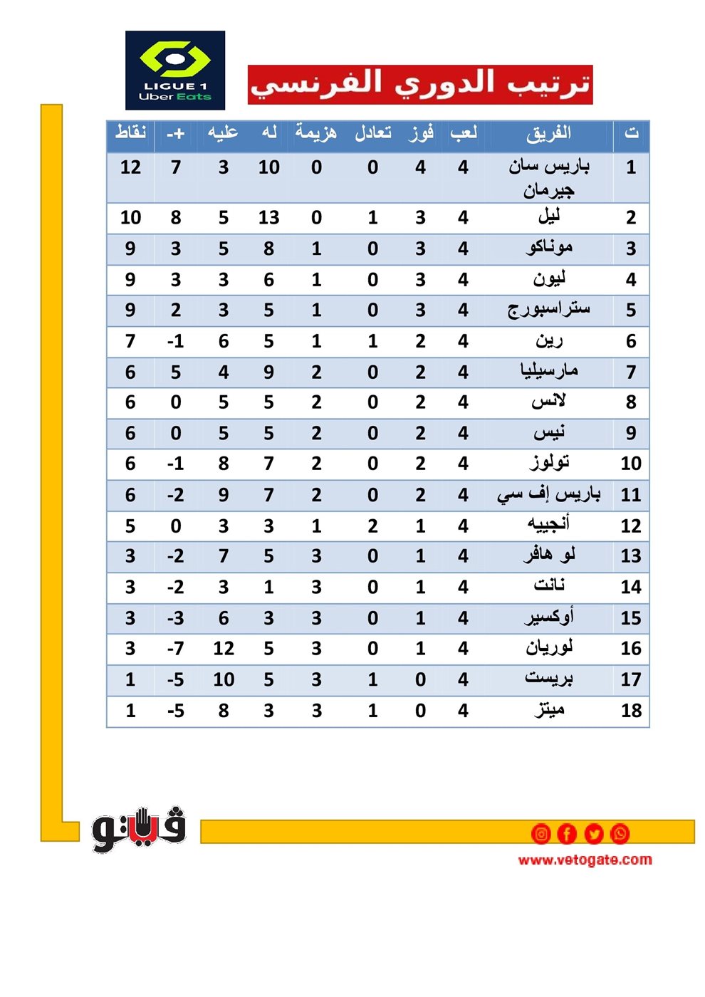 ترتيب الدوري الفرنسي بعد الجولة الرابعة