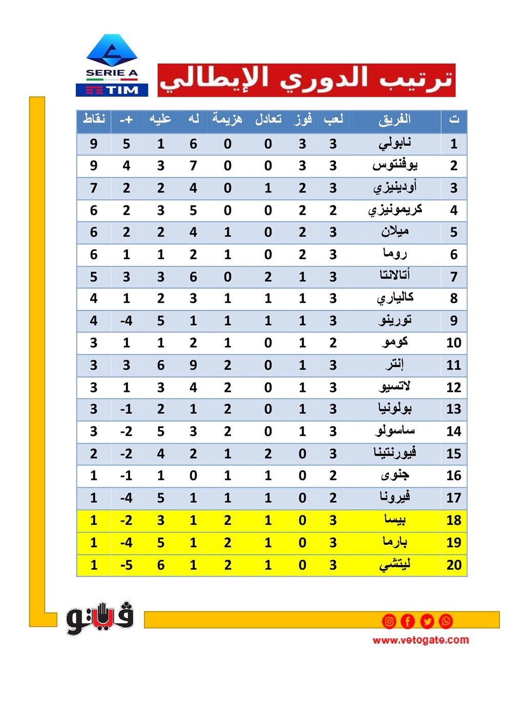 ترتيب الدوري الإيطالي قبل ختام الجولة الثالثة