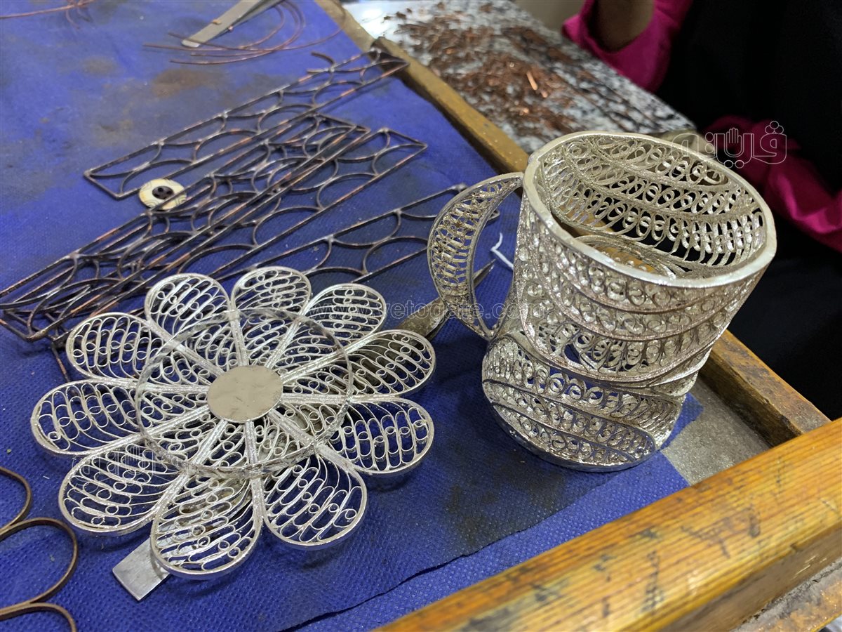 مراحل التصنيع المعقدة تمر بخطوات دقيقة ومحسوبة، من بينها: اختيار التصميم المطلوب وفصله بعناية، ثم لحام القطعة بمهارة عالية، تليها عملية التلميع الشاقة، وأخيرًا تغطيتها بالنيكل ثم الفضة، وهكذا يتحول السلك البسيط والعادي إلى قطعة فنية رائعة تتحدث بلغة الجمال الخالص والإبداع الأصيل.