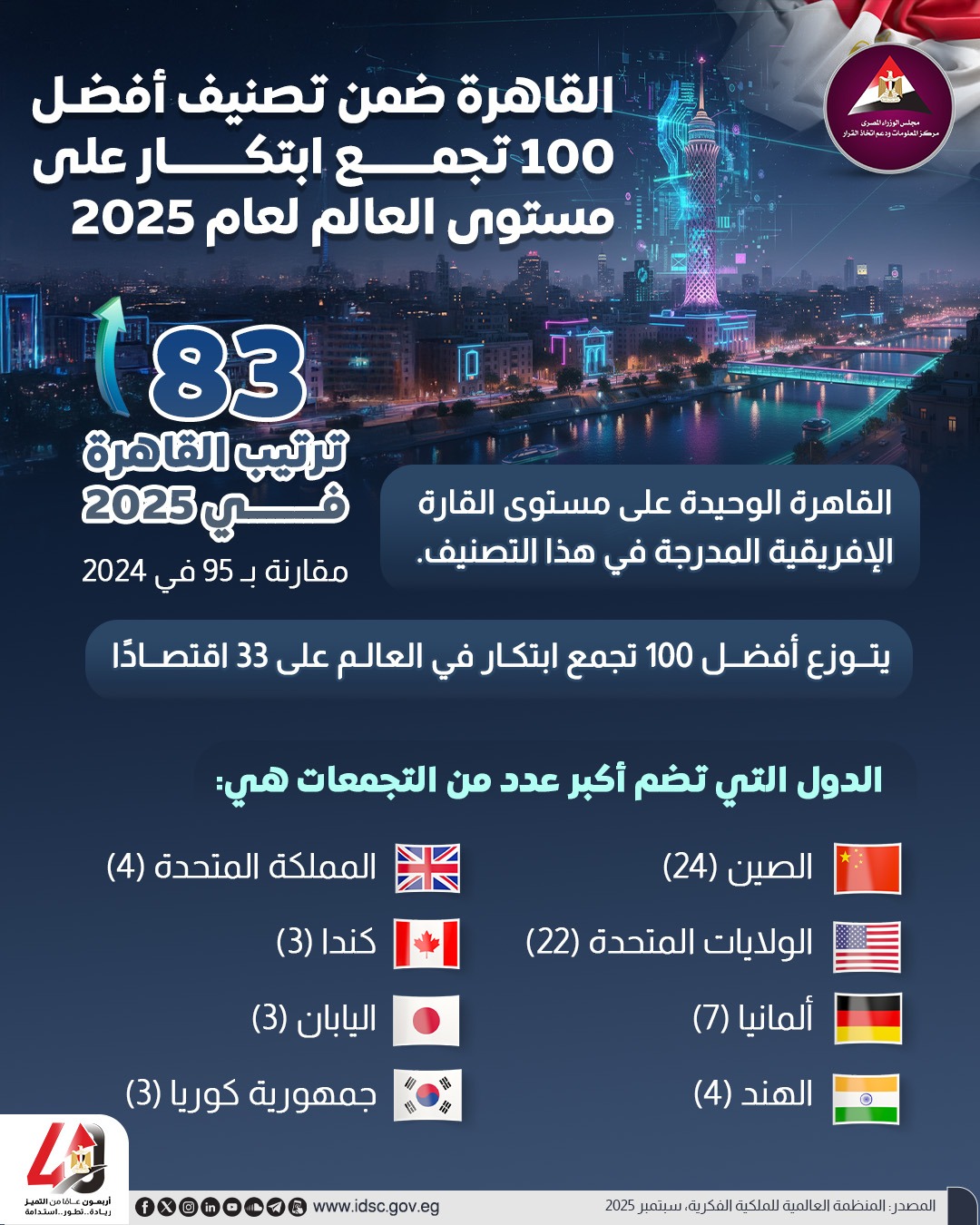 القاهرة تتقدم 12 مركزًا في تصنيف أفضل تجمعات الابتكار عالميًا لعام 2025