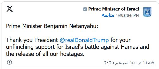 وقال مكتب نتنياهو: "شكرًا للرئيس ترامب على دعمك الثابت لمعركة إسرائيل ضد حماس ولتحرير جميع الرهائن".