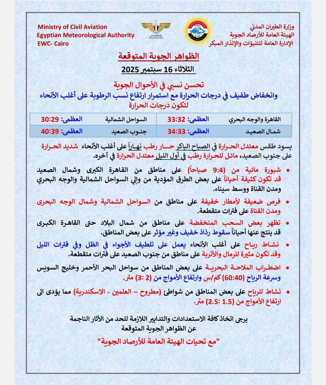 ومن المتوقع أن يسود طقس حار رطب نهارا على القاهرة الكبرى وعلى الوجه البحري ورطب على السواحل الشمالية وشديد الحرارة رطب على جنوب الصعيد وجنوب سيناء.