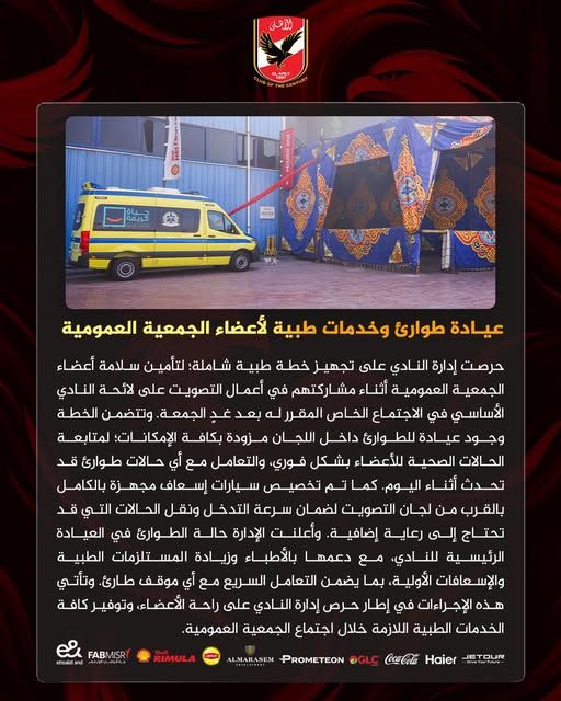 وتأتي هذه الخطوة في إطار حرص الأهلي على توفير أعلى مستويات الراحة والأمان لأعضاء جمعيته العمومية، وتقديم جميع الخدمات الطبية اللازمة خلال فعاليات الاجتماع.
