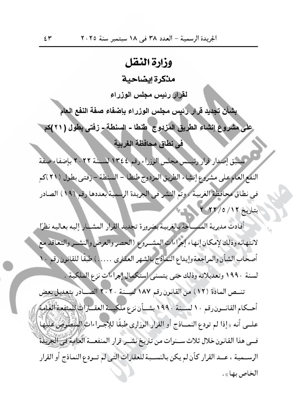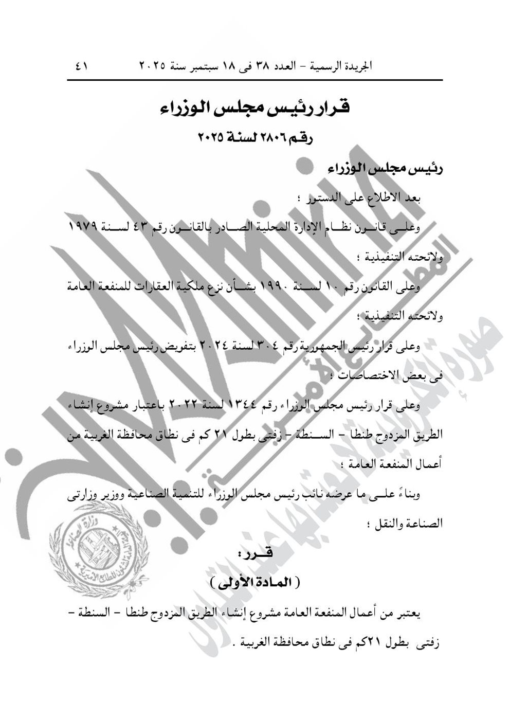 وينص قرار رئيس الوزراء الجديد رقم 2806 لسنة 2025، على "اعتبار مشروع إنشاء الطريق المزدوج طنطا- السنطة- زفتى، بطول 21 كيلو مترا فى نطاق محافظة الغربية، من أعمال المنفعة العامة".