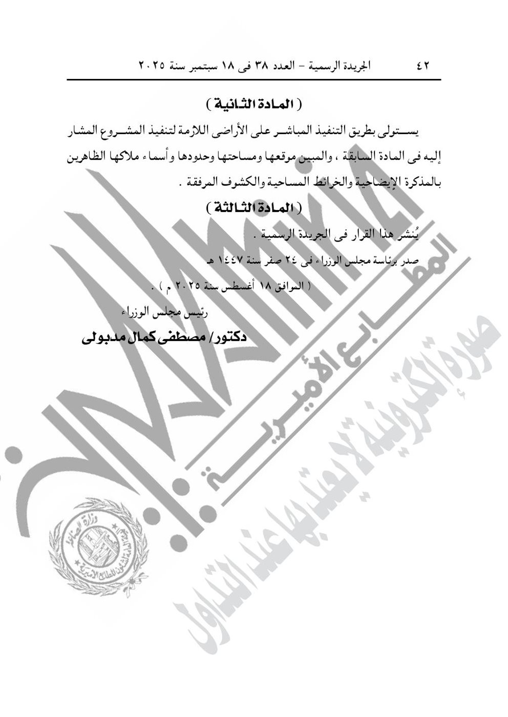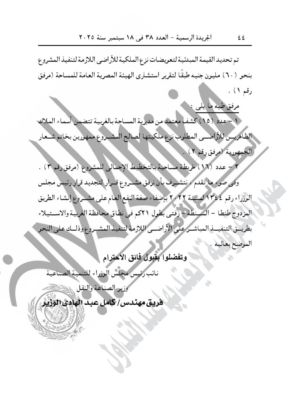 نشرت الجريدة الرسمية في عددها رقم 38، الصادر في 18 سبتمبر 2025، قرارا جديدا لرئيس الوزراء الدكتور مصطفى مدبولي، بشأن الاستيلاء بطريق التنفيذ المباشر على الأراضى اللازمة لتنفيذ مشروع الطريق المزدوج بالغربية.