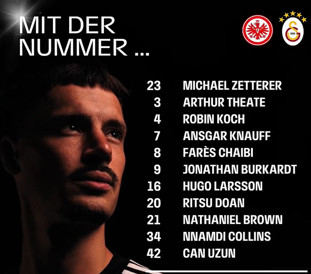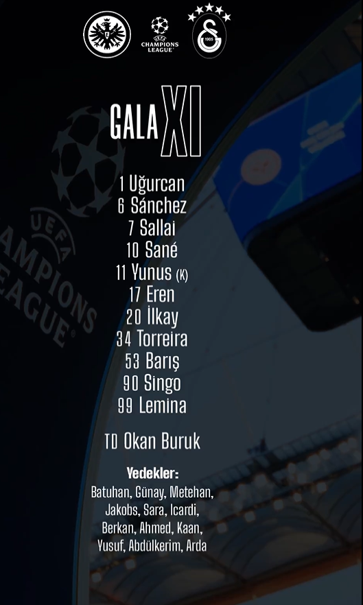 وسجل خماسية فراكفورت كل من: دافيسون سانشيز لاعب جالطة سراي بالخطأ في مرماه بالدقيقة 37، كان أوزون في الدقيقة 45+2، ويلفريد سينجو لاعب جالطة سراي بالخطأ في مرماه بالدقيقة 45+4، وجوناثان بوركاردت في الدقيقة 66 وأنسجار كناوف في الدقيقة 75.