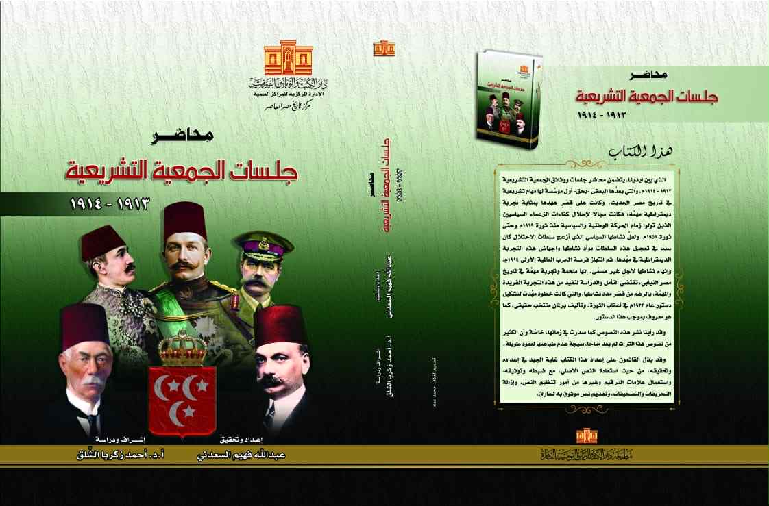 أصدرت الهيئة العامة لدار الكتب والوثائق، برئاسة الدكتور أسامة طلعت، من خلال مركز تاريخ مصر المعاصر كتابا بعنوان “محاضر جلسات الجمعية التشريعية ١٩١٣ - ١٩١٤”، إعداد وتحقيق الباحث عبد الله السعدني، وإشراف وتقديم ودراسة الدكتور أحمد زكريا الشلق.