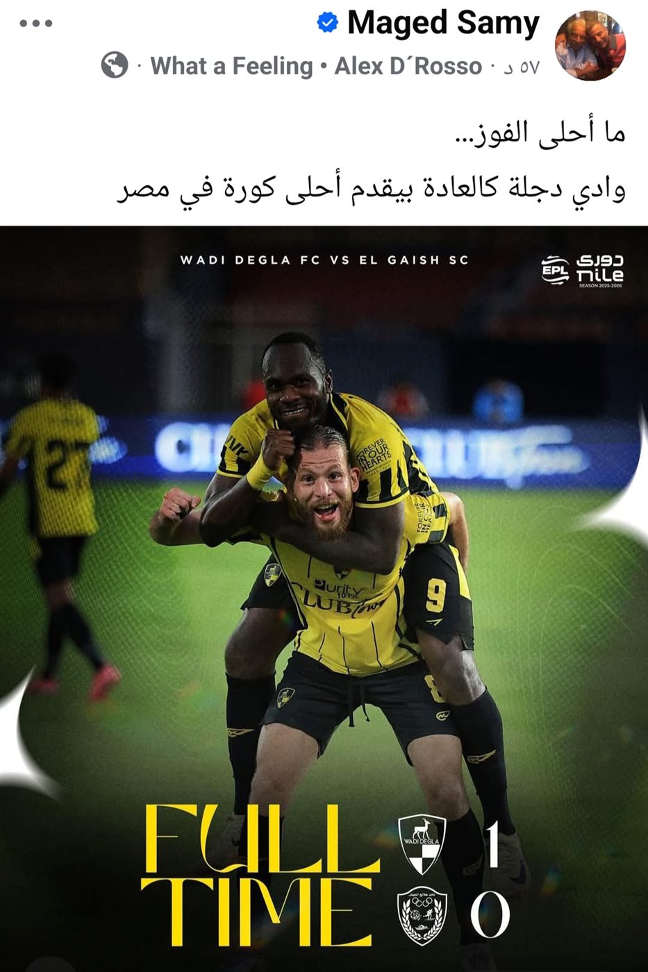 ونشر ماجد سامي عبر حسابه الشخصي بموقع التواصل الاجتماعى فيسبوك:"ما أحلى الفوز…وادي دجلة كالعادة بيقدم أحلى كورة في مصر"