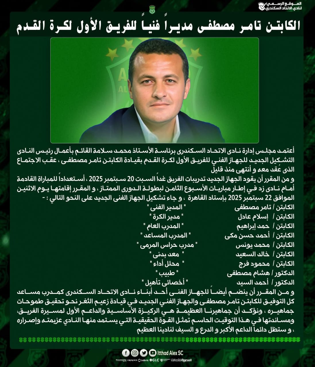 تعاقد نادي الاتحاد السكندري مع تامر مصطفى، المدير الفني السابق لفريق الإسماعيلي، ليتولى القيادة الفنية للفريق خلفًا لأحمد سامي، الذي تم إنهاء عقده بسبب تراجع النتائج.
